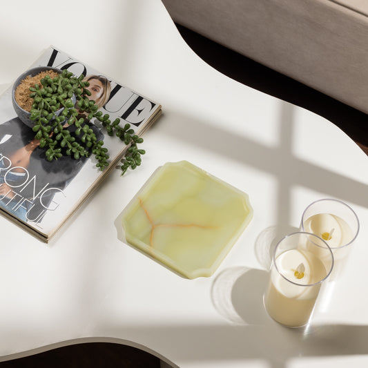 Carved from natural green onyx, this sculptural tray celebrates the quiet beauty of stone in...