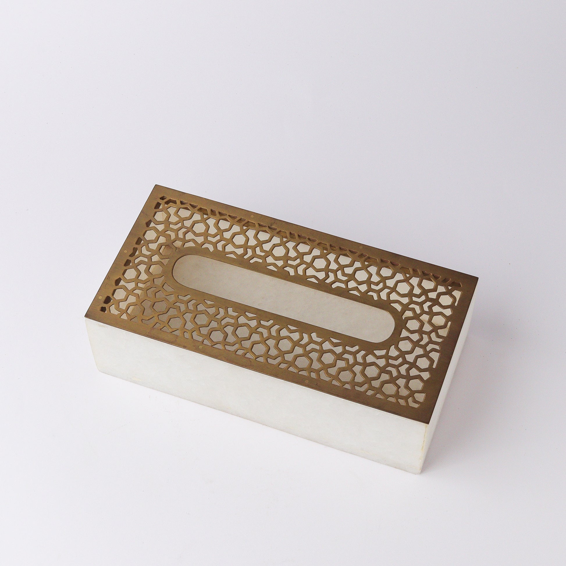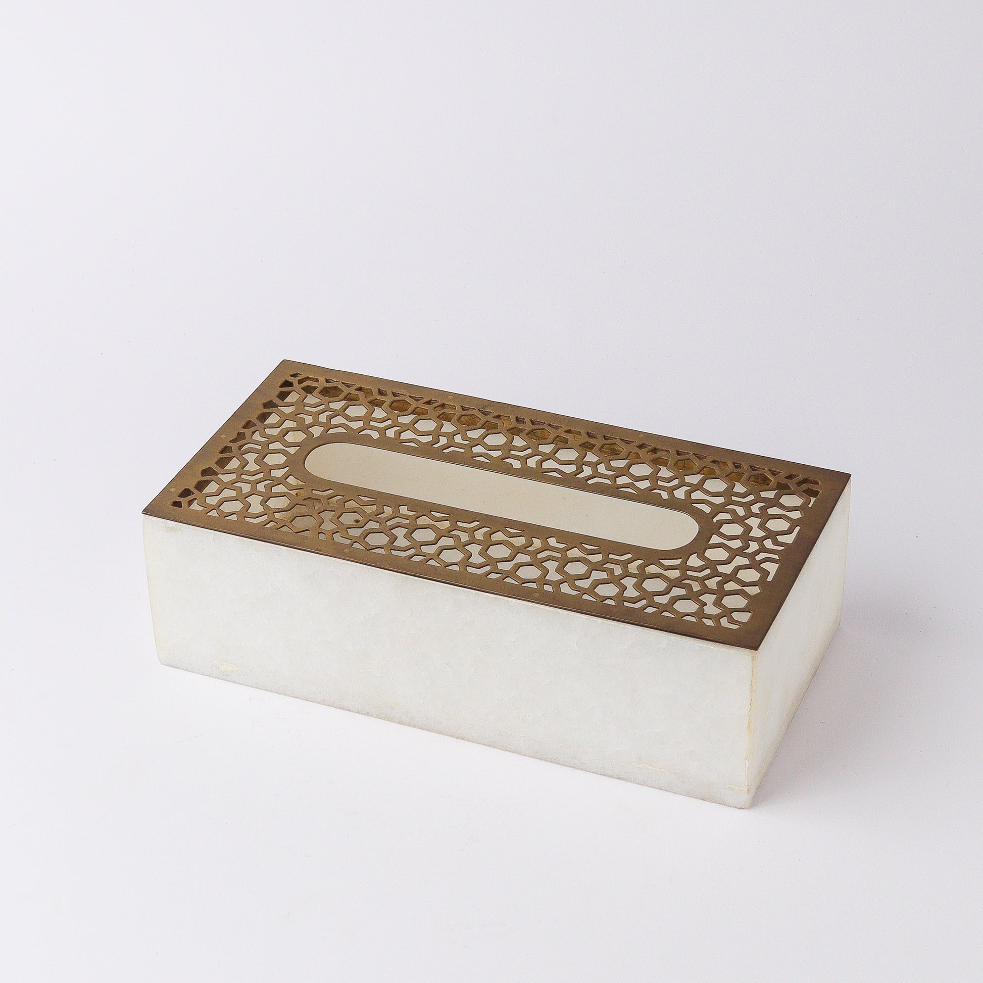 Crafted from pure white marble and adorned with an exquisite cut brass trellis lid, this elegant container is the perfect solution for stylishly storing tissue papers. The combination of luxurious materials and meticulous craftsmanship results in a piece that is both functional and aesthetically pleasing. The smooth, cool texture of the white marble complements the intricate, shimmering design of the brass lid, creating a harmonious balance between modern sophistication and timeless elegance. This container is ideal for any room, adding a touch of refinement to your décor while keeping your tissue papers neatly concealed.