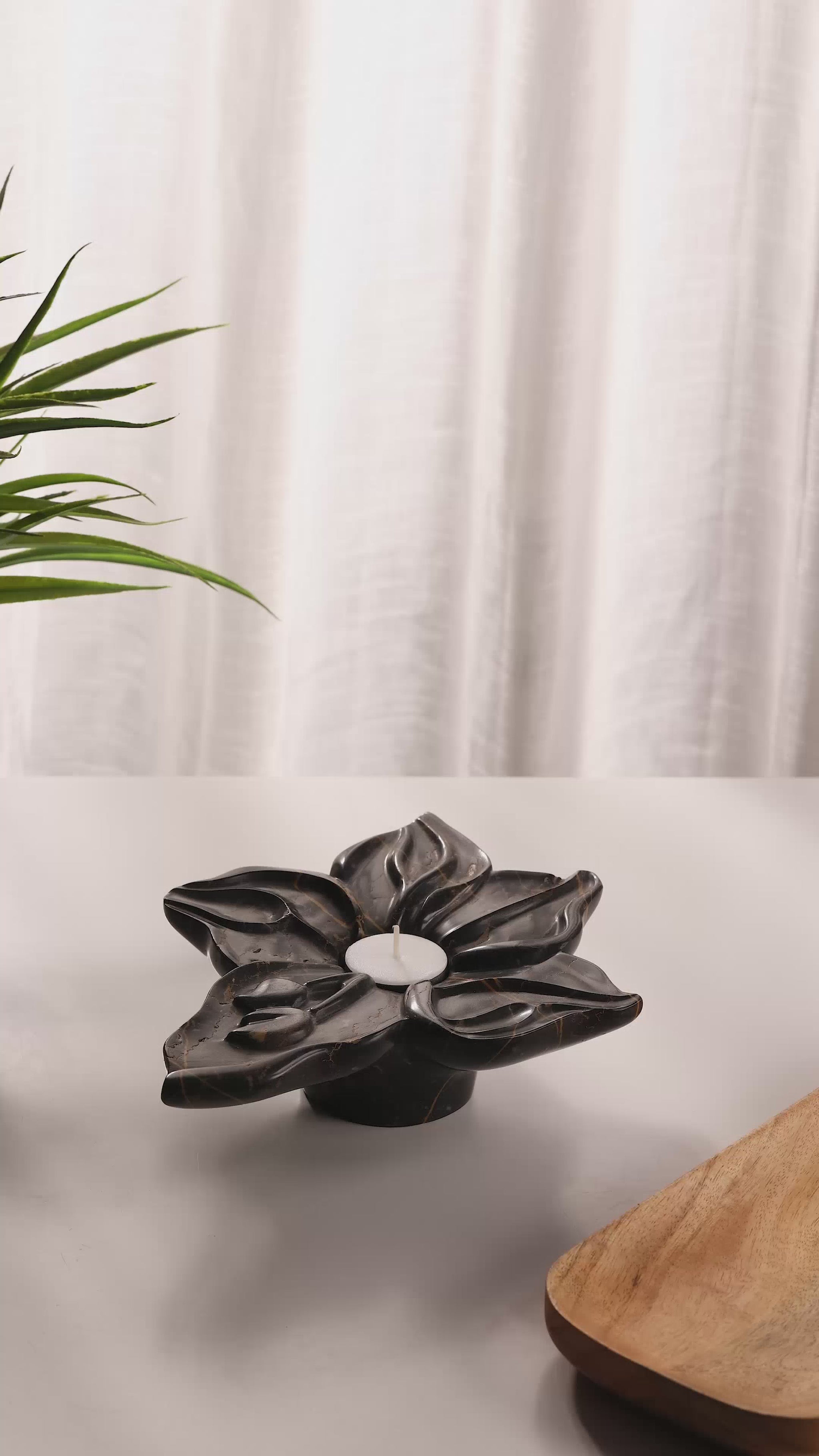 Illuminate your space with our exquisite flower-shaped tealight candle holder, expertly hand-carved from Black Marble adorned with unique vein textures. Inspired by the natural beauty of flowers in bloom, each piece is crafted with meticulous care, ensuring a one-of-a-kind creation with distinct variations in form and shape.