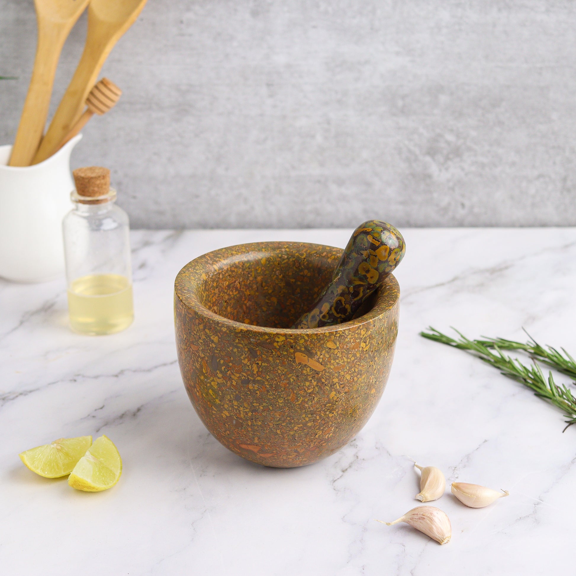 Handcrafted from rare Ajooba fossil stone, prized for its natural beauty and therapeutic benefits. Its extra large size allows for effortless pounding and grinding of everyday ingredients — from cloves and garlic to pepper and ginger — making it both functional and classic.