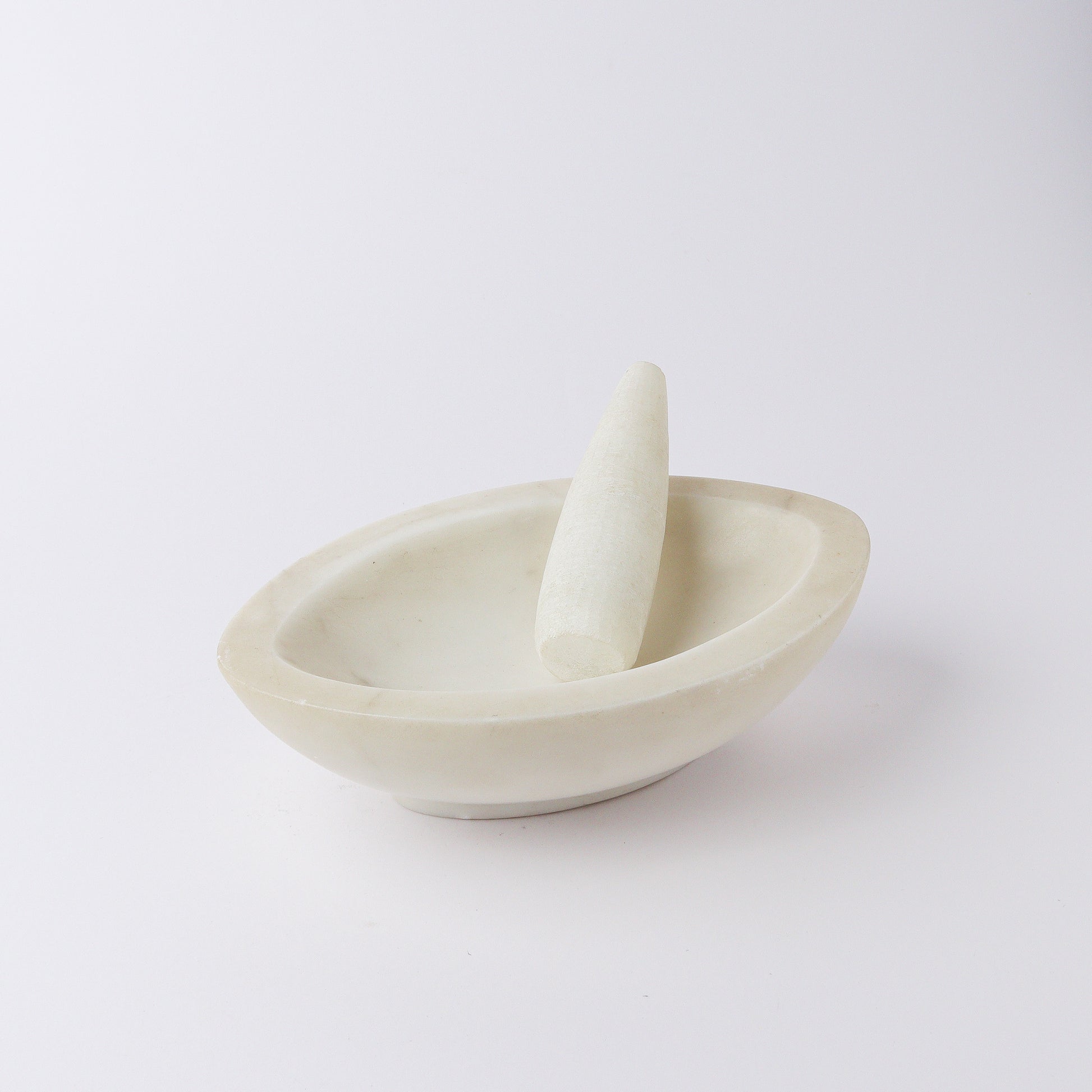 Handcrafted from fine Sangemarmar marble, this traditional boat-shaped mortar and pestle is designed for precision grinding. Perfect for small quantities of aromatic ingredients like saffron, cardamom, or fresh herbs, it preserves the authentic texture and flavor of your spices. The smooth, durable marble not only enhances performance but also adds an enduring touch to your kitchen or dining table.