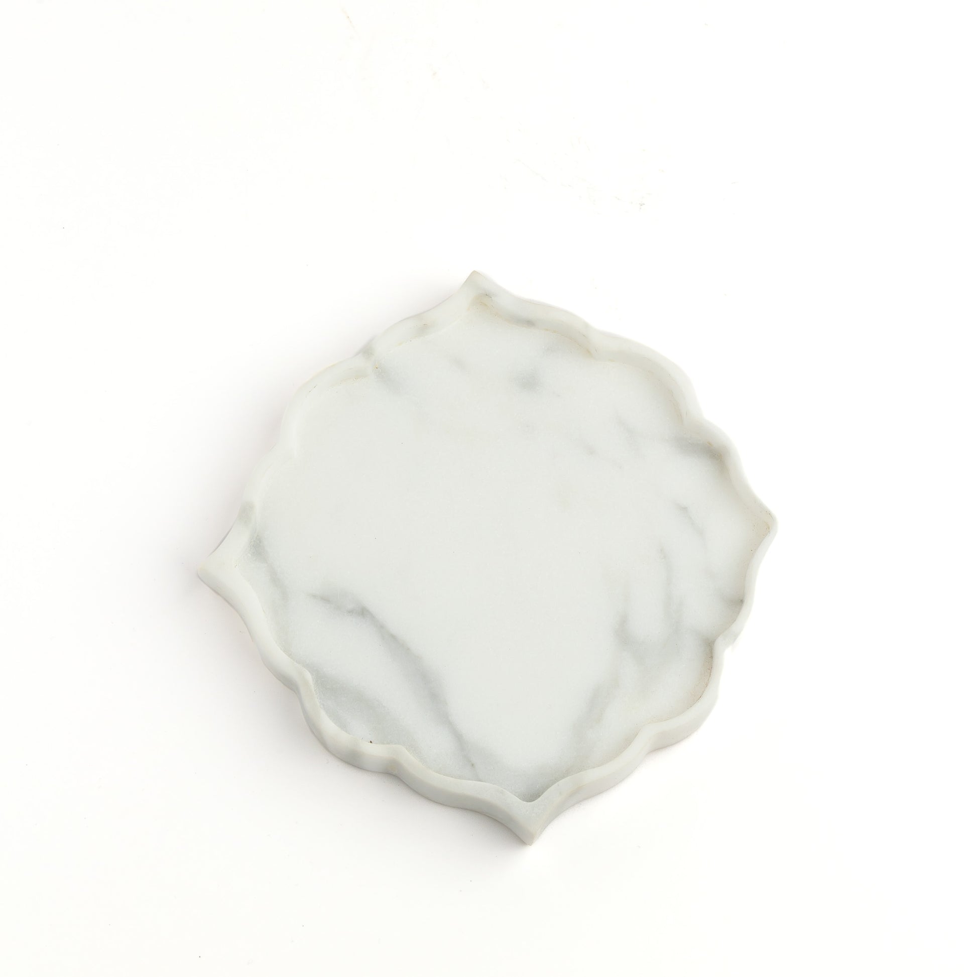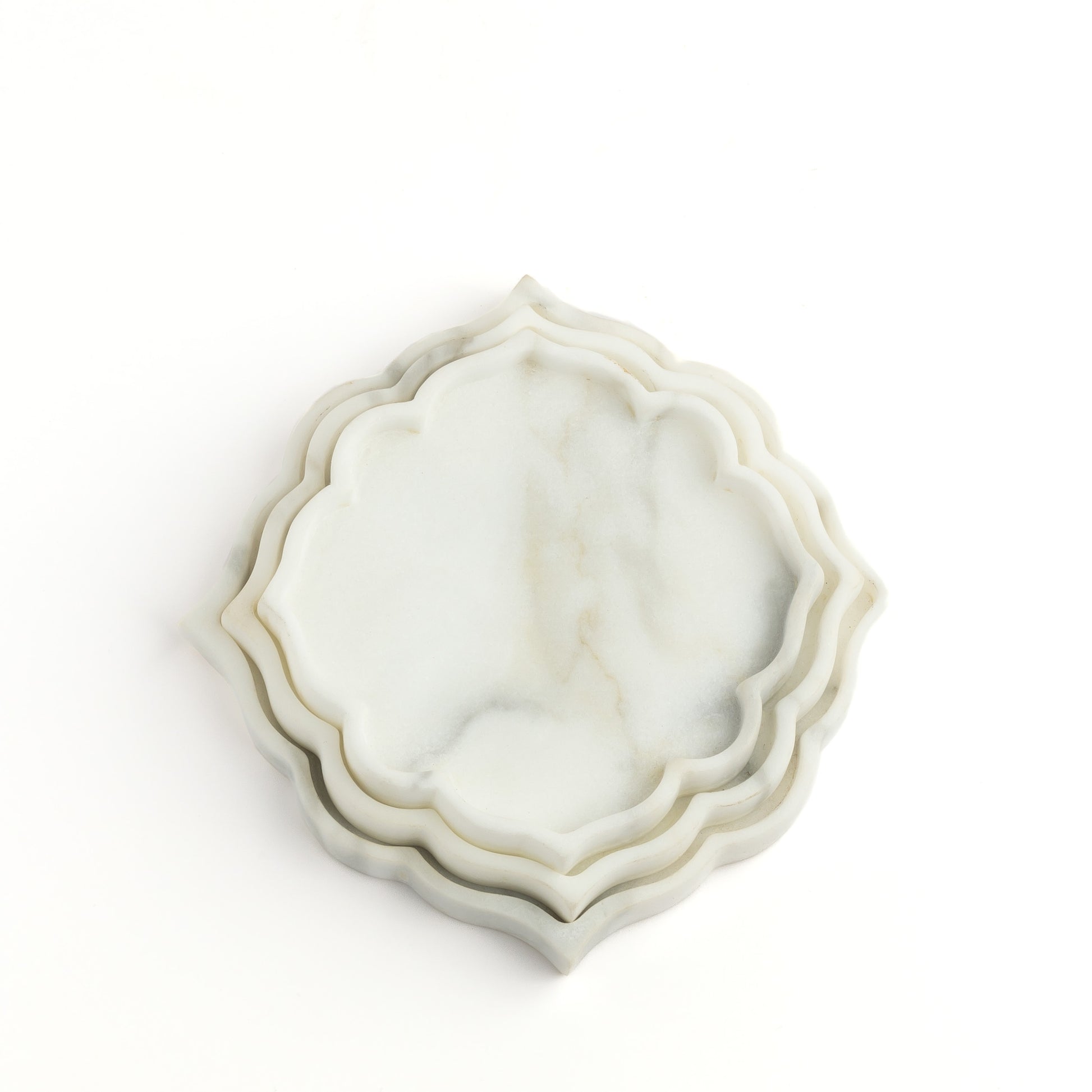 Set of three elegantly crafted rectangular Carrara Marble Trays, inspired by Mughal Garden Flower Bed shapes. They are perfect for serving dry foods, organizing your office desk, or enhancing your home decor with their stackable design.