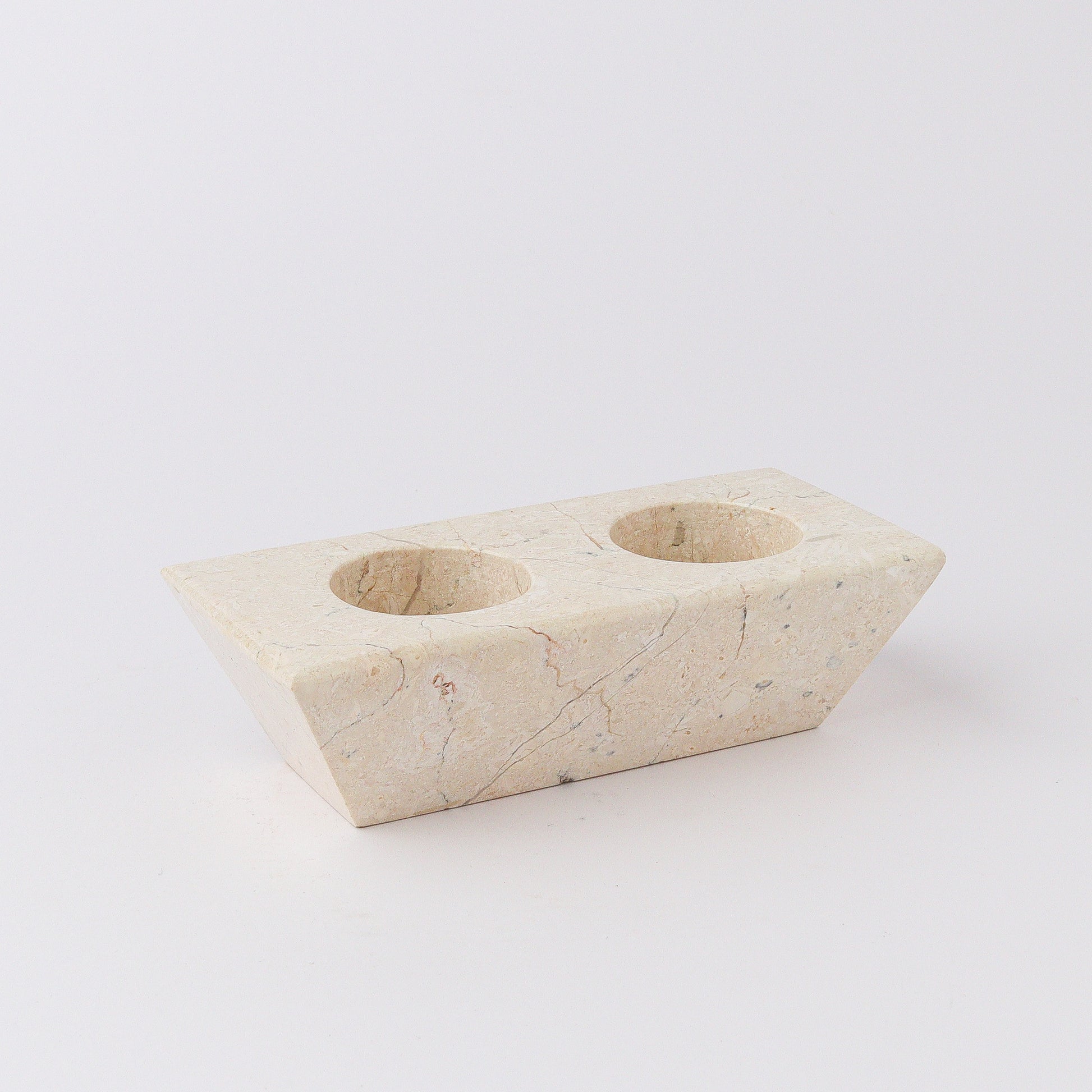Crafted from luxurious Italian marble, this twin tealight holder is designed to bring refined elegance to any space. Its minimalist, straight-lined shape complements various interior styles, from modern to eclectic. The holder accommodates two tealights, offering a soft, ambient glow perfect for cozy evenings or special gatherings. An ideal statement piece, it combines timeless marble beauty with contemporary style, making it a versatile addition to any decor.
